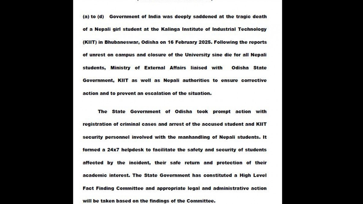 କିଟ୍ ବିଶ୍ବବିଦ୍ୟାଳୟ ପରିସରରେ ନେପାଳୀ ଛାତ୍ରୀ ପ୍ରକୃତି ଲାମସାଲ୍ ଆତ୍ମହତ୍ୟା ଘଟଣାକୁ ଦୁଇ ମାସ ହେବାକୁ ଯାଉଛି। ମାତ୍ର ଏପର୍ଯ୍ୟନ୍ତ ଏହି ଘଟଣାର ତଦନ୍ତ କରୁଥିବା ଉଚ୍ଚ-ସ୍ତରୀୟ ତଦନ୍ତ କମିଟିର ରିପୋର୍ଟ ସାର୍ବଜନୀନ ହୋଇପାରିଲା ନାହିଁ। ତେବେ ରାଜ୍ୟ ସରକାର ଗଢ଼ିଥିବା ଉଚ୍ଚ-ସ୍ତରୀୟ ତଦନ୍ତ କମିଟିର ରିପୋର୍ଟ ଆଧାରରେ କିଟ୍ ବିରୋଧରେ ଆବଶ୍ୟକ ଆଇନଗତ ଓ ପ୍ରଶାସନିକ କାର୍ଯ୍ୟାନୁଷ୍ଠାନ ନିଆଯିବ ବୋଲି ଲୋକସଭାରେ ଏପ୍ରିଲ 4 ତାରିଖରେ ଲିଖିତ ଉତ୍ତର ଦେଇଛନ୍ତି ବୈଦେଶିକ ରାଷ୍ଟ୍ରମନ୍ତ୍ରୀ କୀର୍ତ୍ତି ବର୍ଦ୍ଧନ ସିଂହ।