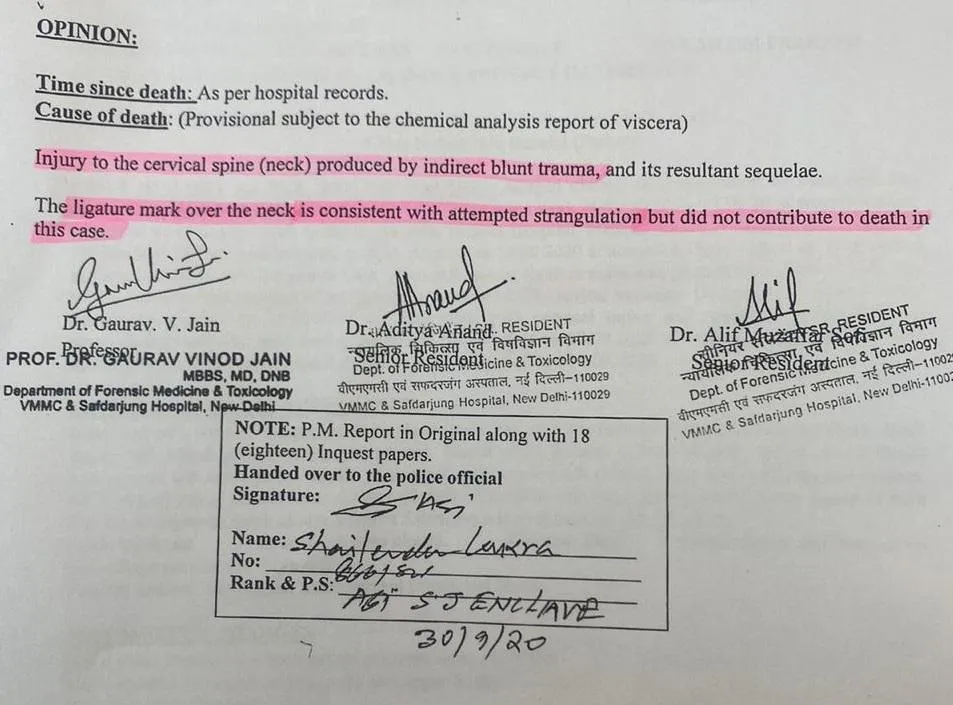 ସଫଦରଗଞ୍ଜ ହସ୍ପିଟାଲ ପକ୍ଷରୁ ଜାରି କରାଯାଇଥିବା ବ୍ୟବଚ୍ଛେଦ ରିପୋର୍ଟ ଅନୁଯାୟୀ, ଭିସେରା ରିପୋର୍ଟ ଆସିବା ପରେ ହିଁ ପୀଡ଼ିତାଙ୍କ ମୃତ୍ୟୁର କାରଣ ସ୍ପଷ୍ଟ ହୋଇପାରିବ। ତେବେ ବ୍ୟବଚ୍ଛେଦ ରିପୋର୍ଟରେ ଗଳାରେ ଚିହ୍ନ ଥିବା ନେଇ ସ୍ପଷ୍ଟ କରାଯାଇଛି।