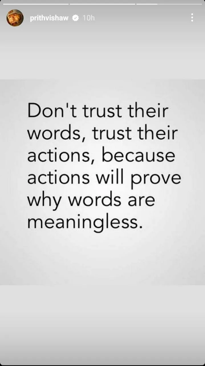 ତେବେ ଦକ୍ଷିଣ ଆଫ୍ରିକା ବିପକ୍ଷ ଦିନିକିଆ ସିରିଜ ପାଇଁ ଡାକରା ନ ମିଳିବାରୁ ଶ’ ଗୋଟିଏ ପୋଷ୍ଟ ଇନଷ୍ଟାଗ୍ରାମରେ କରିଛନ୍ତି। ଏଥିରେ ସେ କାହାକୁ ଟାର୍ଗେଟ କରି ନାହାନ୍ତି। କିନ୍ତୁ ସେ ଲେଖିଥିବା କଥା ବେଶ ଚର୍ଚ୍ଚାର ବିଷୟ ପାଲଟିଛି। ଶ’ ଲେଖିଛନ୍ତି, “ସେମାନଙ୍କ ଶଦ୍ଦକୁ ବିଶ୍ୱାସ କରନାହିଁ। ସେମାନଙ୍କ କାର୍ଯ୍ୟକୁ ବିଶ୍ୱାସ କର। କାରଣ କାର୍ଯ୍ୟ ହିଁ ପ୍ରମାଣ କରେ ଶବ୍ଦ କାହିଁକି ମୂଲ୍ୟହୀନ।”